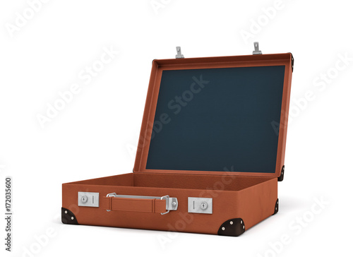 3d rendering of an open brown retro suitcase revealed to hold nothing.