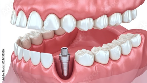 3D rendering of dental implants with jawbone support and abutment placement displayed with anatomical precision.