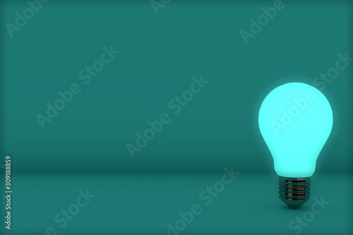 3d rendering of leadership and different creative idea concepts. Turquoise shiny light bulb on turquoise background. Realistic light bulbs idea banner on abstract scene with place for text.