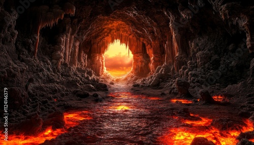 3D Rendering of Magma-Heated Cave with Volcanic Jewelry Stones: Deep Dungeon Descent to Hell Throne