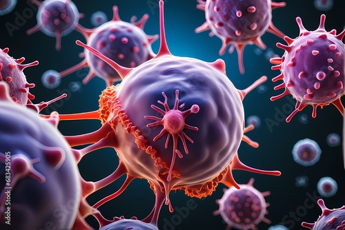 3D rendering of microscopic human and cancer cells on science day background