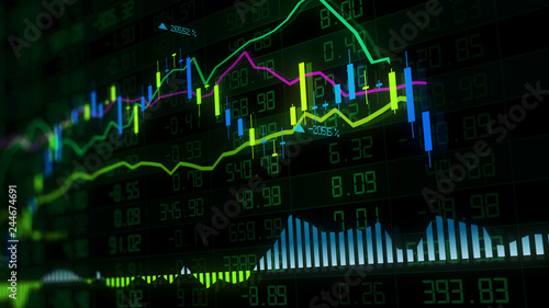 3D rendering of stock indexes in virtual space. Economic growth, recession