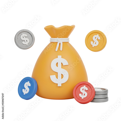 3d rendering vector icon of a money bag with coins isolated on transparent background