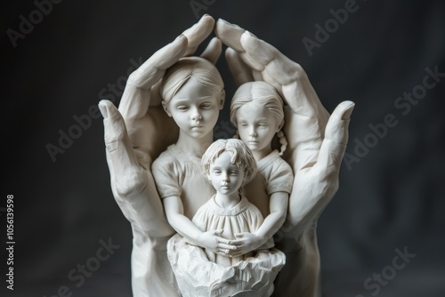 3D sculpture portraying two human hands gently cradling small figures of a girl and boy