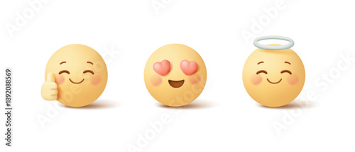3D set of cute emoticons, emojis on white background. Angel, in love, like. Positive expressions for design concepts. Icons. Vector illustration.