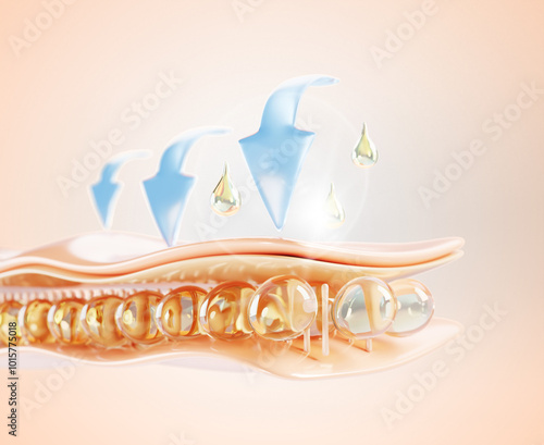 3d skin structure with gold oil drop, vitamin serum or collagen essence render background. Epidermis cell layer with liquid cosmetic retinol droplets and blue arrows, skincare concept. 3D illustration