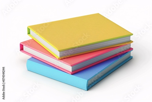 3D stack of colorful notebooks with yellow, pink, and blue covers on a white background.