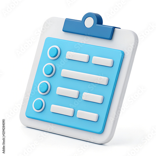 3D Stylized clipboard with checklist items and spaces for text, on a plain white background, Minimal 3D icon render.