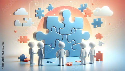 3D Team members discussing puzzle strategy with soft abstract digital art background copy space on right. concept as Team members discussing puzzle strategy with a soft abstract digital art background