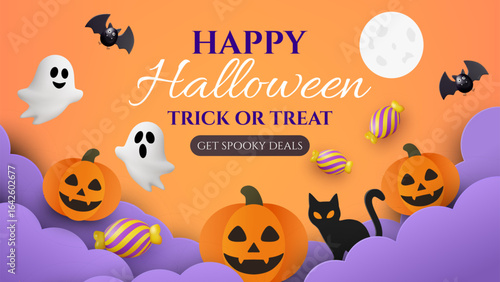 3D vector illustration of Happy Halloween Trick or Treat promotion advertising in orange-purple tones with paper cut style. Smiling pumpkin, ghost, bat, candy, black cat for banner, poster.