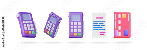 3d vector set collection of payment terminal, paper receipt, and bank card. Online payment method and financial transaction concept for e-commerce.