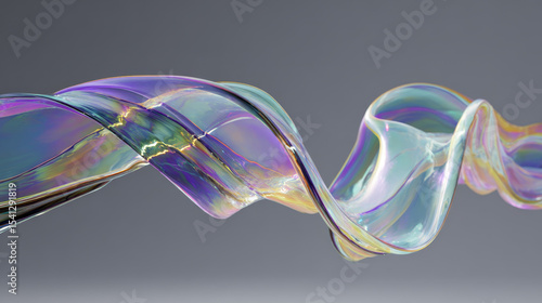 3D visualization of a clear, liquid-glass ribbon in motion, showcasing a holographic gradient and fluid design