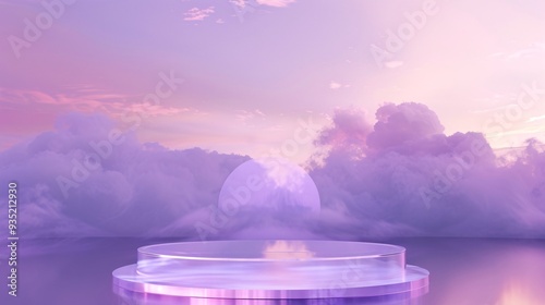 4. Elegant transparent podium with blank space, front view, against a purple gradient cloudy sky background, creating a calm and enchanting atmosphere for abstract content showcase