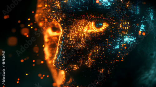 53. cybernetic humanoid robot face, half human half machine, glowing circuits, sci-fi background