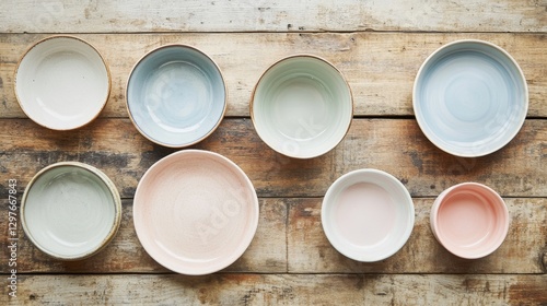 53.A top-down view of vintage-inspired ceramic tableware in soft pastels, neatly arranged on a weathered wooden tabletop with natural light highlighting their smooth finishes.