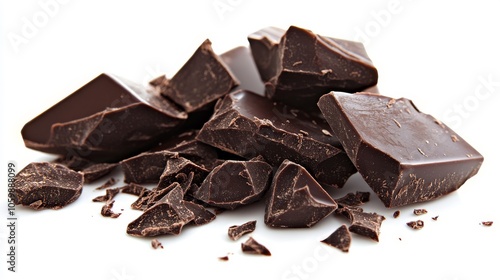70.A high-resolution shot of dark chocolate pieces isolated on white, with close attention to the fine details of the broken surfaces and a deep, rich color contrast between the chocolate and the