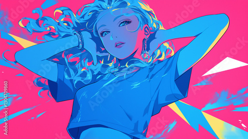 80年代レトロフューチャー風アニメ、ヘッドフォンをつけた少女とカラフルな未来都市のイラスト