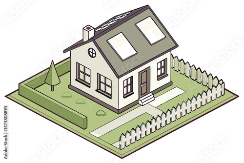 80 3d model, isometric illustration, small house with solar panels, white exterior, green lawn and bushes, picket fence, detailed architectural design