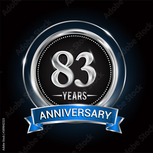 83rd birthday logo with silver ring and blue ribbon, Vector design template elements for anniversary celebration, wedding, jubilee, greeting card, invitation, party.