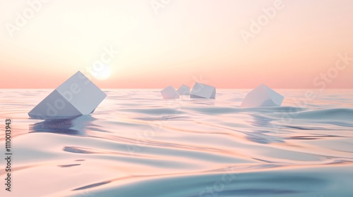 87.A digital rendering of a calm water surface, reflecting soft light as gentle ripples spread outward. Geometric shapes, such as floating cubes and pyramids, emerge from the water, creating a