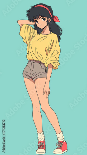 日本の古き懐かしいレトロな雰囲気で描いた女性のアニメイラスト。シンプルな背景に女の子が立っている。スマートフォン9:16のアスペクト比