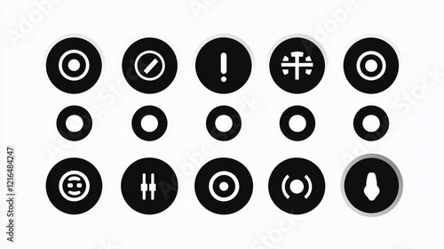 92.A vector set featuring bold circular power symbols in both filled and outlined styles, including start and shutdown variations, designed in clean black and white with subtle shadows.