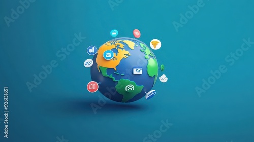 A 3D earth globe is surrounded by floating icons representing global connectivity, communication, and technology on a blue background.