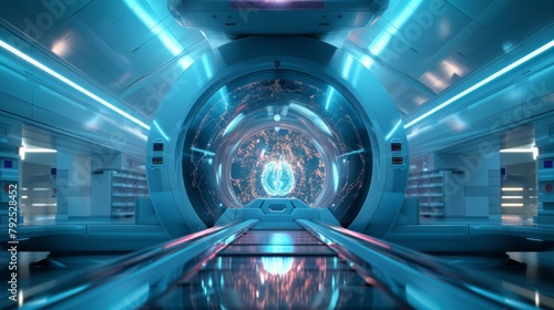 A 3D holographic image of an MRI machine, showing its intricate internal structure. The background is a soothing blue, providing a calm space for text.