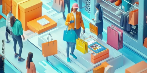 A 3D image shows people shopping online. They're buying things on a mobile app, ordering items, and getting digital receipts. This image is perfect for websites and other online graphics.