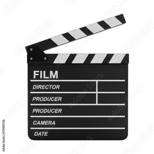 A 3D open black and white film clapperboard displaying production details