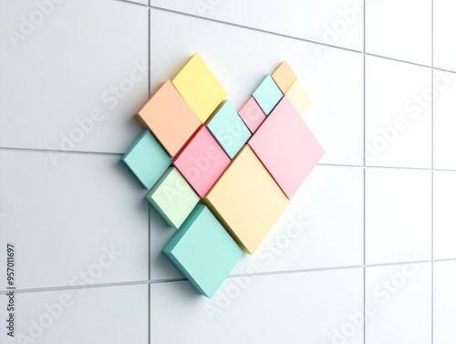 A 3D render of pastelcolored sticky notes in the shape of a heart on a whiteboard