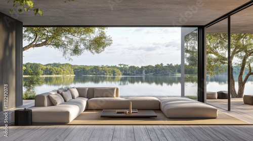 A 3D rendering of a luxurious and spacious living room featuring a modern minimalist design. The focal point is a sleek, contemporary sofa placed on a warm wooden floor, inviting relaxation and comfor