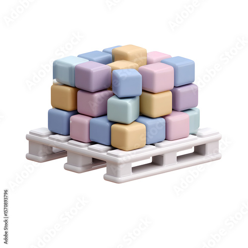 A 3D rendering of a pallet loaded with a stack of soft pastel colored geometric cubes presented in a clean minimalist design
