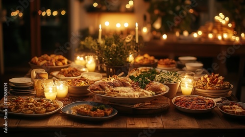 A 4K photo of a table full of delicious food, from savory dishes to sweet treats, highlighted by candles that gently light up the space