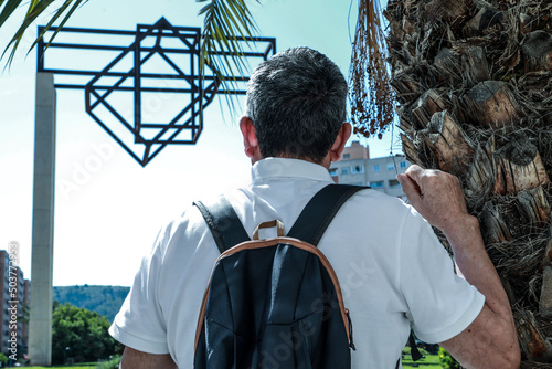 A 60-year-old man wearing sunglasses, on summer vacation sightseeing in the city of Alicante, looking at one of the monuments.