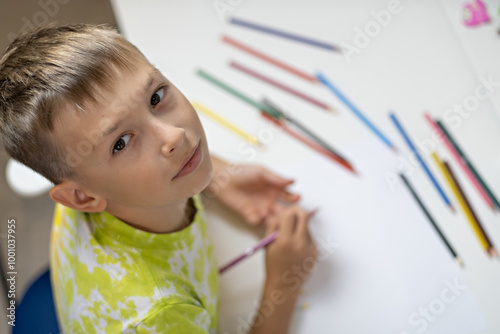 a 9-year-old boy sits at the table and draws, the boy looks at the camera