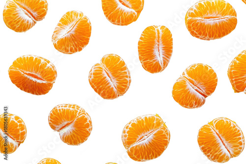 A arrangement of freshly sliced tangerines their juicy segments on a clean white background. perfect for culinary presentations or healthy lifestyle promotions