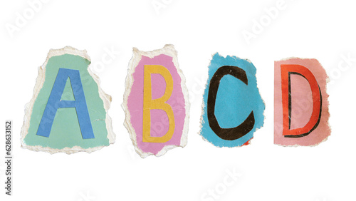 A, B, C and D alphabets on torn colorful paper . Ransom note style letters.