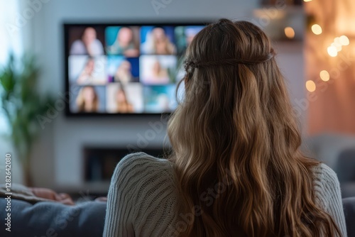 A backview of a Caucasian woman connecting with her friends over a video call while sitting on a couch.