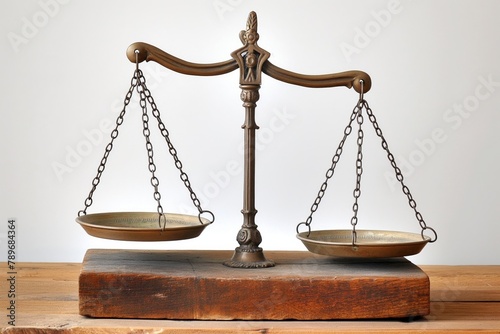 A balanced scale representing justice, symbolically placed on a wooden base with a minimalist design