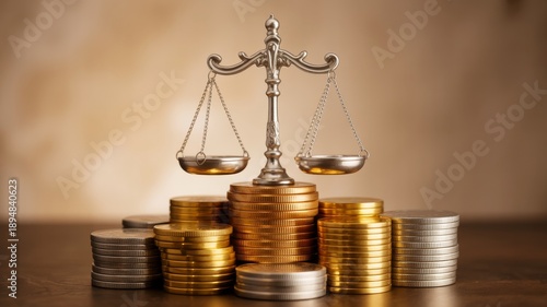 A balanced scale rests atop a pile of gold and silver coins, symbolizing justice and financial equity.