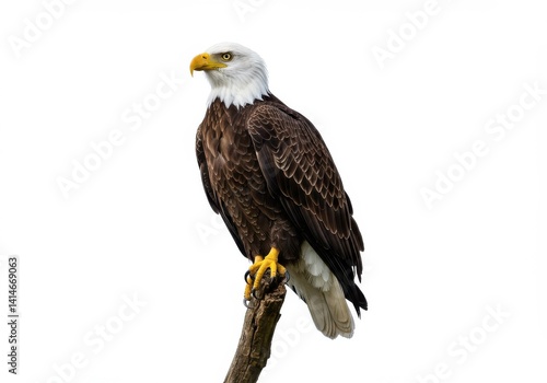 A bald eagle perched on a branch against a white background looking to the left of the frame