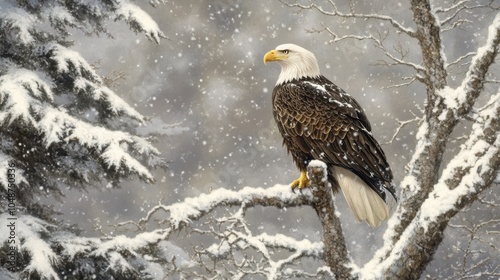 A bald eagle perched on a snowy tree, its feathers contrasting sharply with the winter landscape.