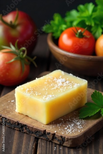 A bar of natural kitchen soap sits on a rustic wooden surface, next to a bowl of fresh vegetables Lather up and clean your dishes naturally , country kitchen, kitchen cleaning, dish soap