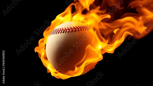 A baseball ablaze with realistic flames, isolated against a dark background for dramatic effect.