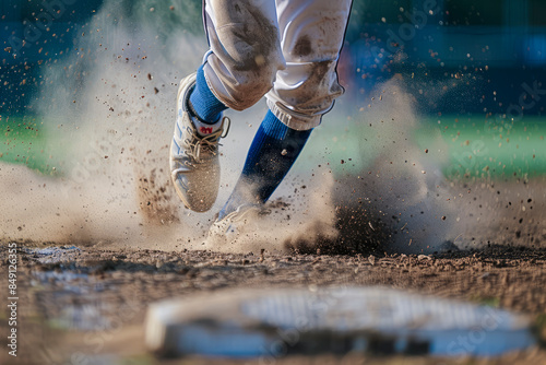 a baseball player sliding into base, with dirt flying, showcasing the sport's dynamic and intense action