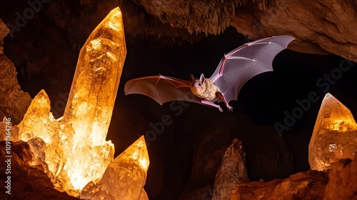 A bat flying through a dark cave lit by glowing crystals.