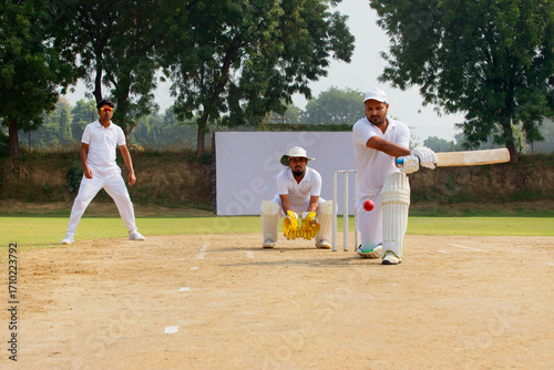 A batsman in white plays a shot as a wicketkeeper and fielder observe, on a bright cricket field