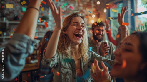 A beaming young woman is surrounded by flying confetti, celebrating joyously at a lively indoor party.