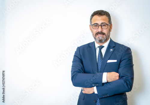 A bearded businessman posing with his arms tied in his suit in front of the background